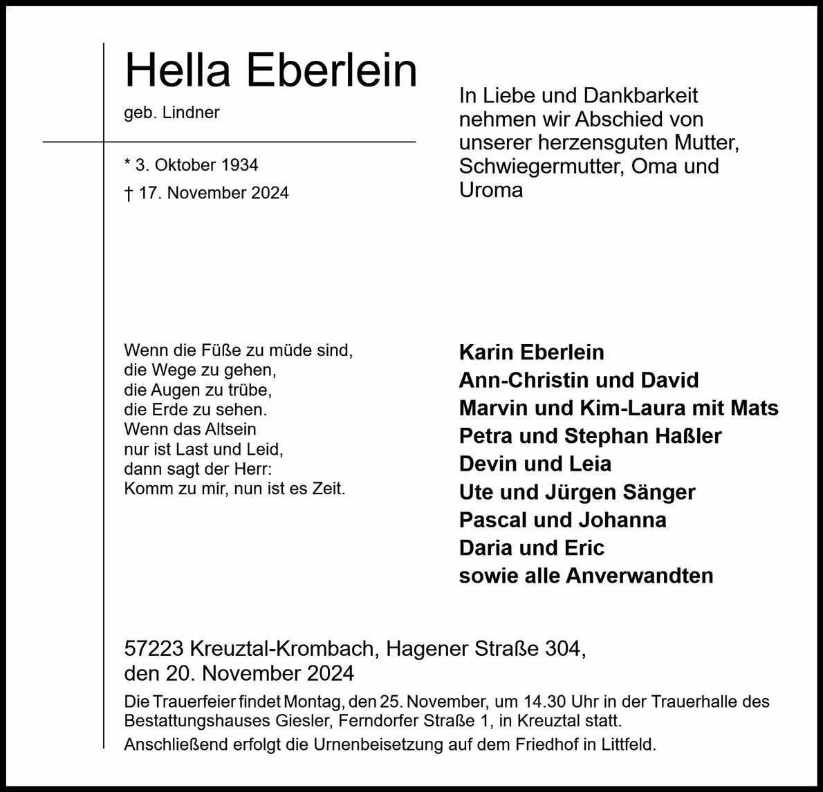 Die Trauerfeier wird begleitet durch:
