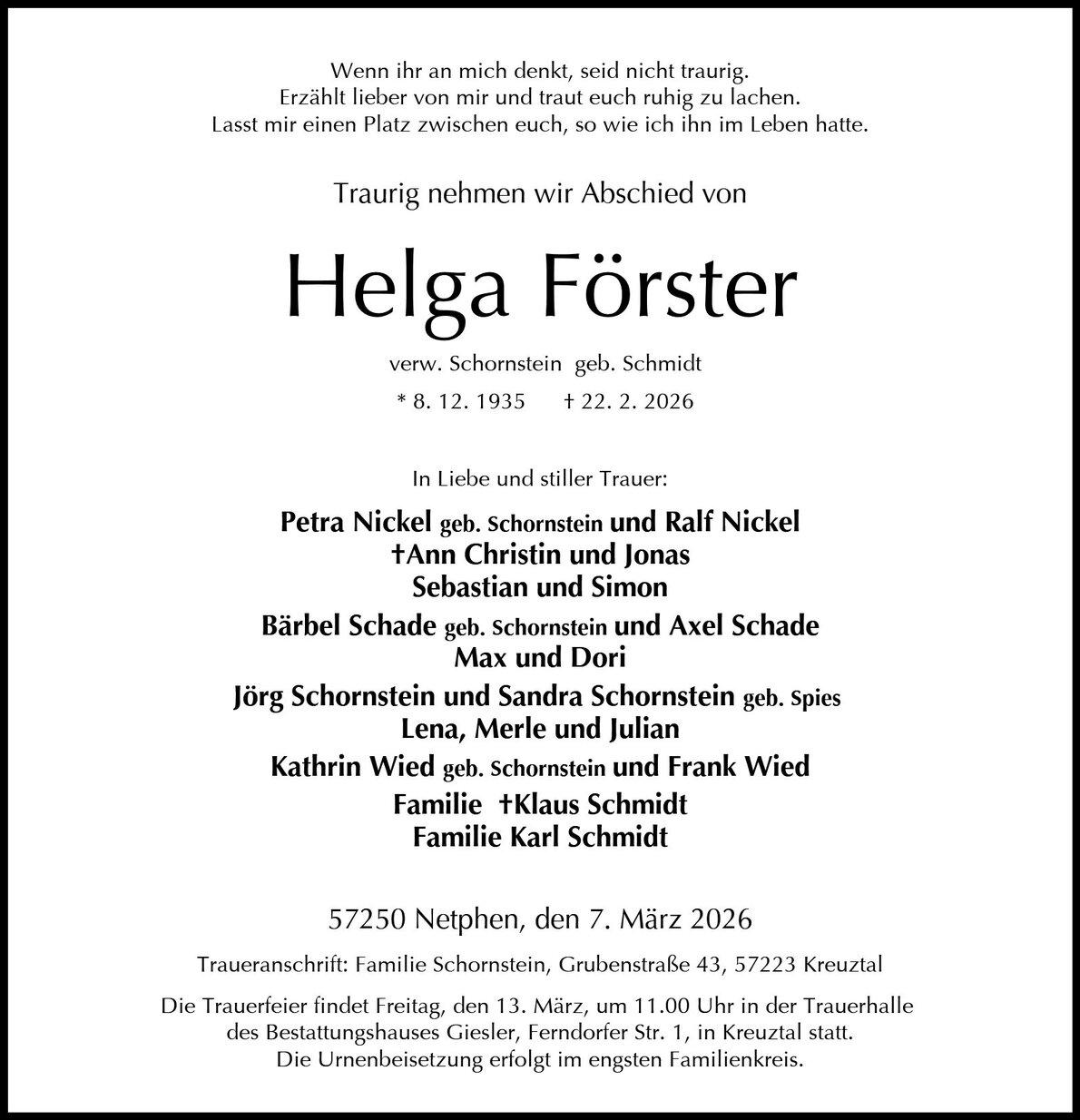 Die Trauerfeier wird begleitet durch: